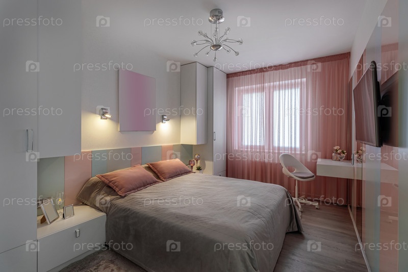 Современная спальня в голубых, розовых и белых тонах с приглушенным освещением. Настоящее фото