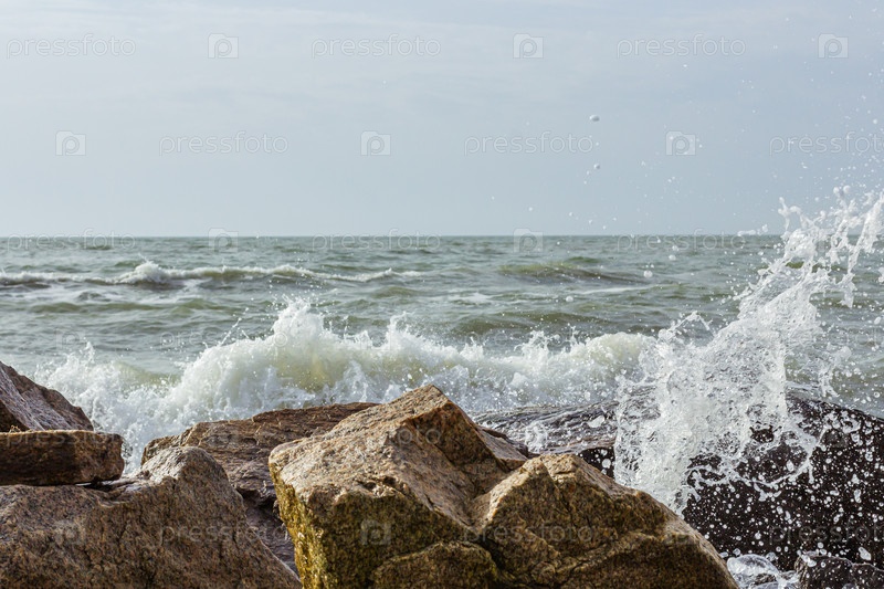 Кадр морского прибоя. Брызги воды ударяются о камень. Океанский прибой среди скал. Фон прилива