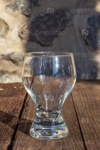 Пустой стакан, на деревянном столе в беседке, в лучах солнца