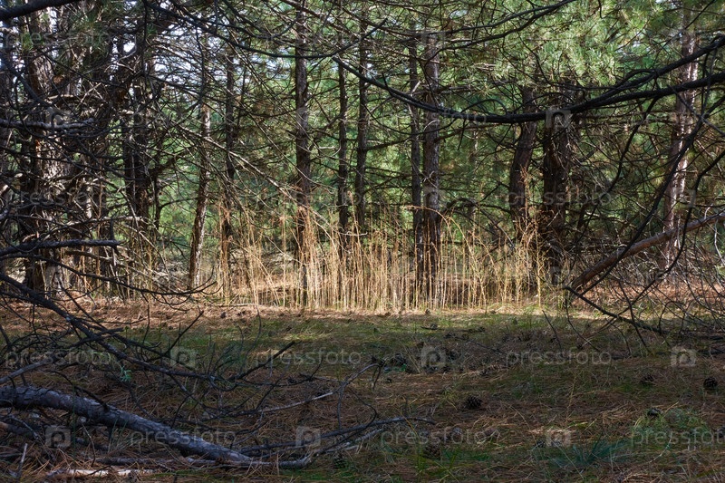 Поляна, заросшая сухой травой посреди соснового леса. Солнечные лучи освещают поляну, усыпанную сосновыми шишками и хвоей