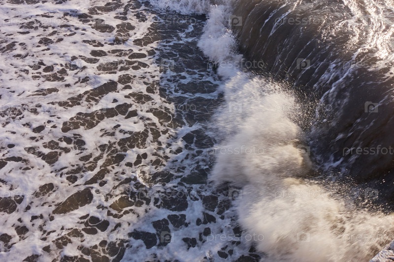Грязная штормовая волна накатывает на берег. Красный закат блестит в волнах