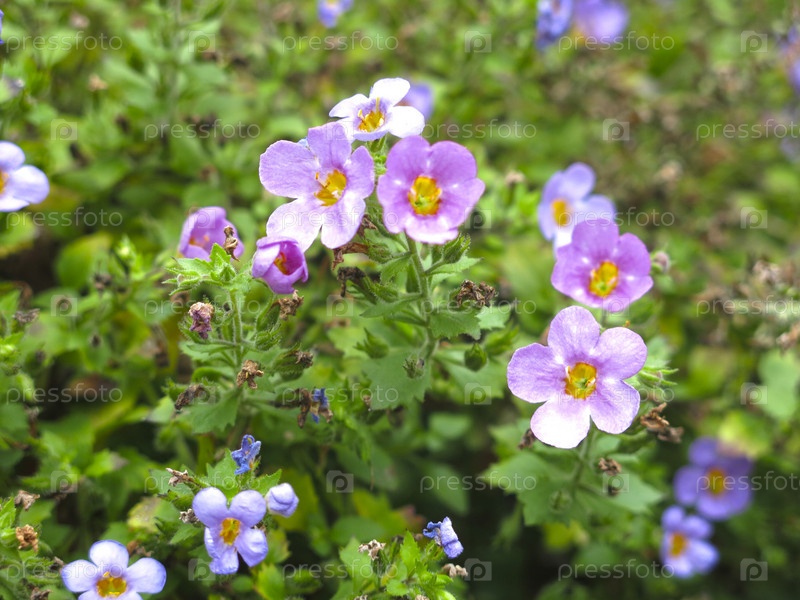 Декоративное растение бакопа (Sutera diffusus, Bacopa diffusus) цветет мелкими разноцветными цветами на улице для украшения в березовом стене