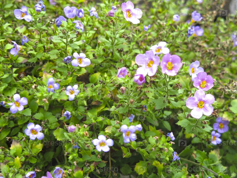 Декоративное растение бакопа (Sutera diffusus, Bacopa diffusus) цветет мелкими разноцветными цветами на улице для украшения в березовом стене