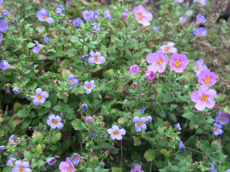 Декоративное растение бакопа (Sutera diffusus, Bacopa diffusus) цветет мелкими разноцветными цветами на улице для украшения в березовом стене