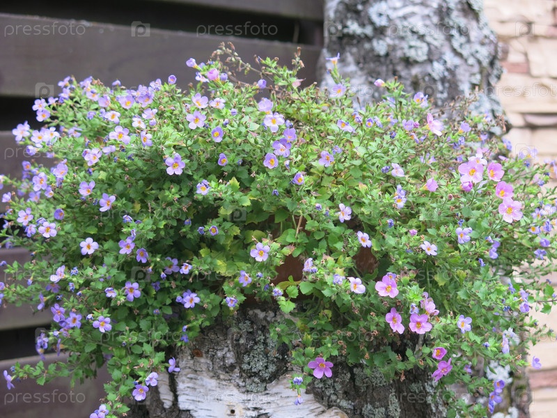 Декоративное растение бакопа (Sutera diffusus, Bacopa diffusus) цветет мелкими разноцветными цветами на улице для украшения в березовом стене