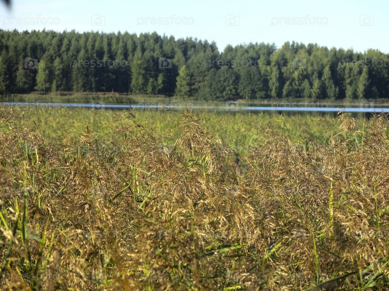 Летнее голубое озеро в Лопатинских карьерах, высокая трава на переднем плане, лес на заднем плане