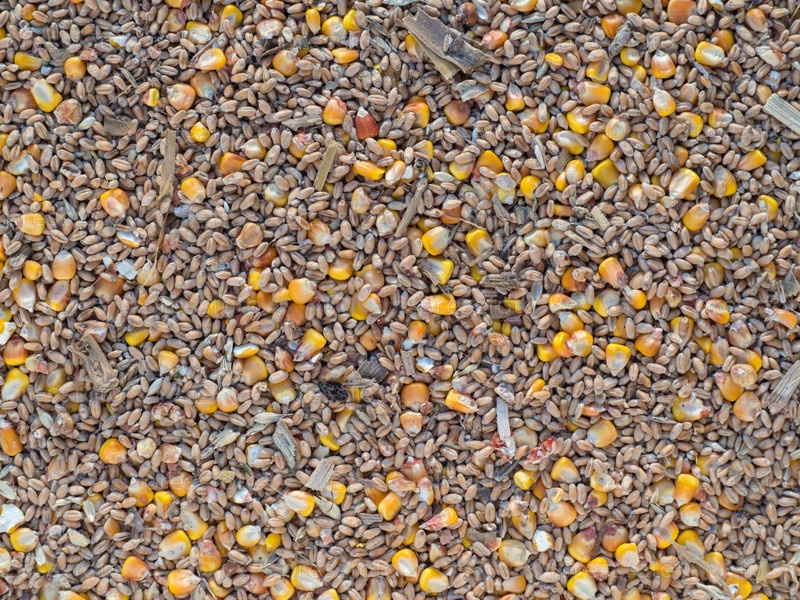 Кормовая зерновая смесь. Зерна пшеницы и кукурузы (кукурузы) на корм животным и птицам. Естественный фон зерна. Натуральный тип зерновой смеси с натуральным мусором