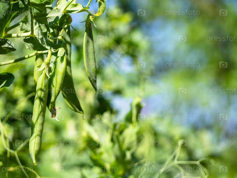 Стручки зеленого гороха висят на растениях гороха в саду. Выращивание натуральных органических овощей для здорового питания. Растения зеленой фасоли на размытом фоне