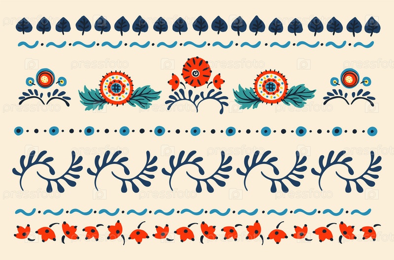 Набор этнических элементов. Бордюр представляет собой полосу с цветами, листьями, ветками, вензелями. Народная вышивка. Славянский, украинский, русский мотив. Хохлома, матрешка, дымковская игрушка. Мексиканский, индийский, цыганский ковер. Вязаное кружево