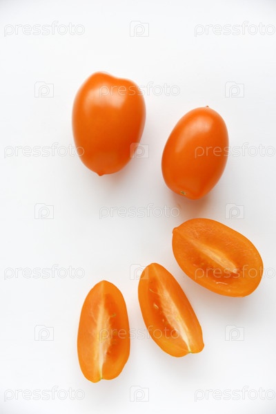 Целые и нарезанные желтые помидоры на белом фоне. Вкусные и сочные желтые помидоры. Плоды томатов в группе крупным планом