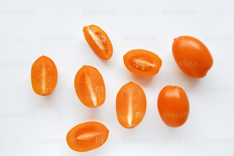 Целые и нарезанные желтые помидоры на белом фоне. Вкусные и сочные желтые помидоры. Плоды томатов в группе крупным планом