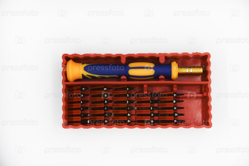 Отвертка со сменными головками на белом фоне. Набор отверток. Комплект для ремонта