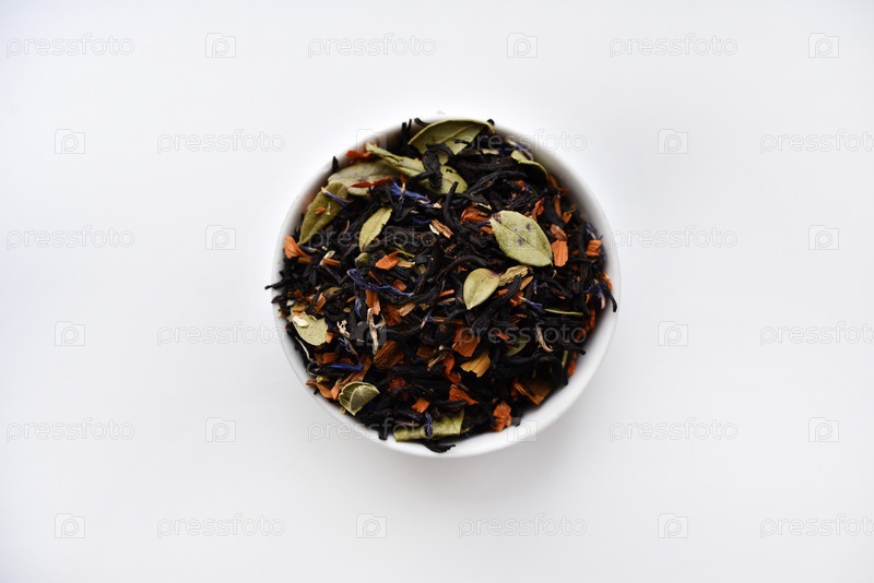 Черный чай со специями в стеклянной чашке на белом фоне. Вкусный чай. Сухой чай
