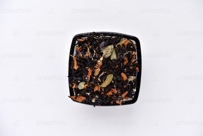 Черный чай со специями в стеклянной чашке на белом фоне. Вкусный чай. Сухой чай