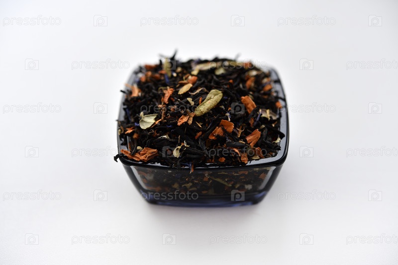 Черный чай со специями в стеклянной чашке на белом фоне. Вкусный чай. Сухой чай