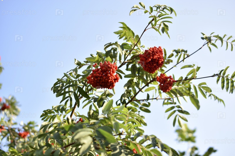 Красная рябина в саду на фоне голубого неба