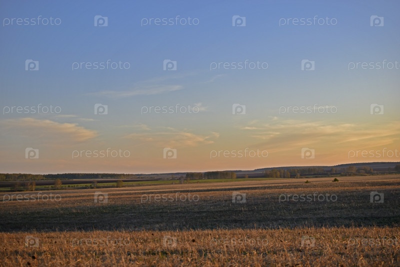Вечерний красивый пейзаж в поле весной с закатом