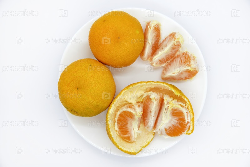 Сочные мандарины на тарелке на белом фоне. Сочные цитрусовые. Кусочки мандаринов