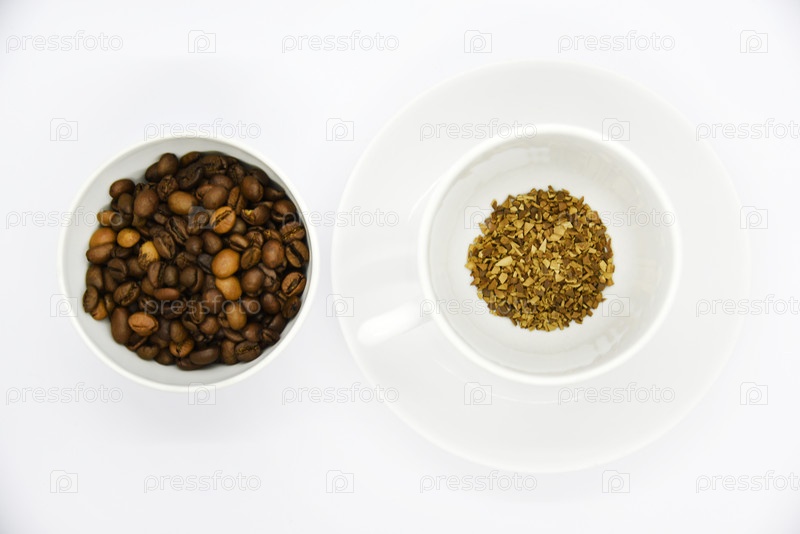Поджаренные кофейные зерна в фарфоровой чашке. Кофейная смесь. Вкусный кофе в зернах и сублимированный