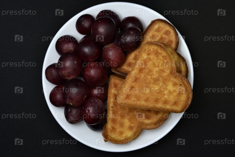 Вкусные вафли и виноград на тарелке. Сладкий завтрак из вафель и красного винограда. Вафли в форме сердца