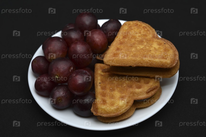 Вкусные вафли и виноград на тарелке. Сладкий завтрак из вафель и красного винограда. Вафли в форме сердца