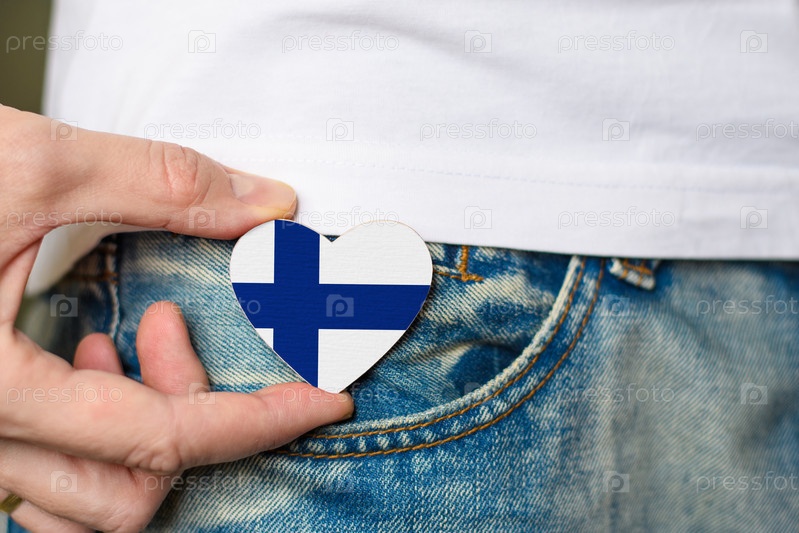 Патриот Финляндии! Деревянный значок с флагом Финляндии в форме сердца в мужской руке. Концепция национального праздника