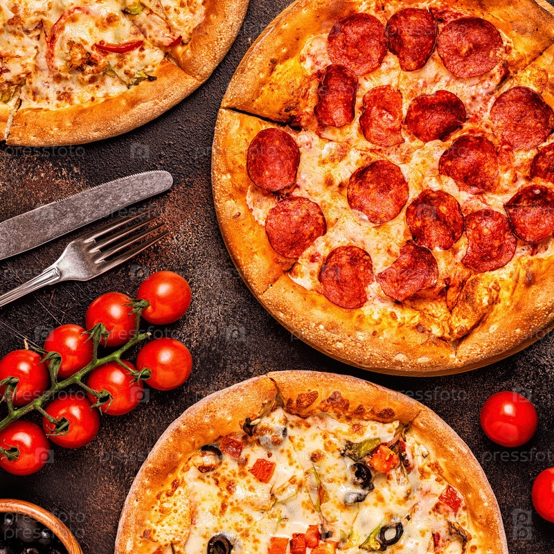 Набор различных пицц - пепперони, вегетарианская, курица с овощами