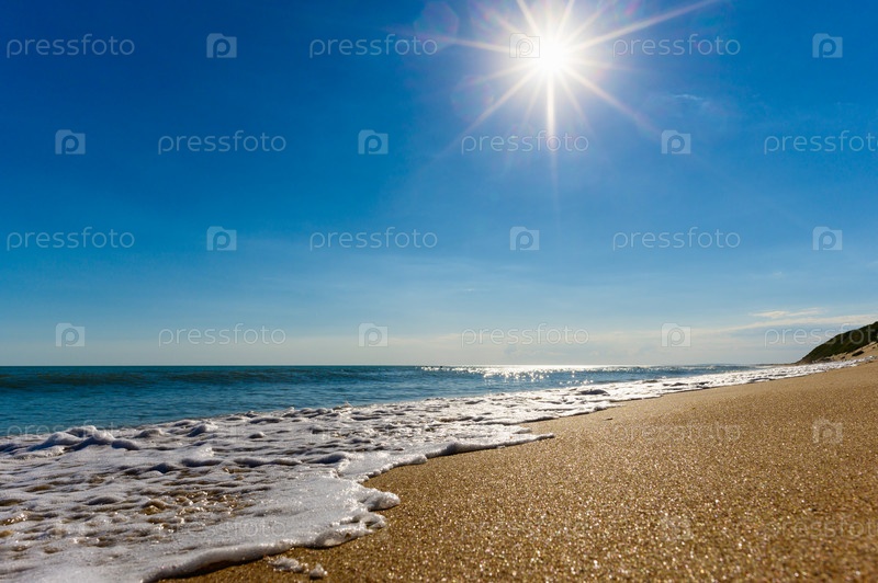 Красивый морской пейзаж. Песчаный берег в яркий солнечный день