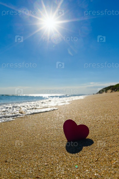 Вертикальный морской пейзаж. Маленькое сердце на песчаном берегу моря на фоне ярких лучей солнца
