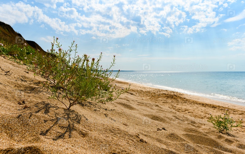 Дикий пустынный берег. Песчаный райский пляж. Селективный фокус на растении на переднем плане