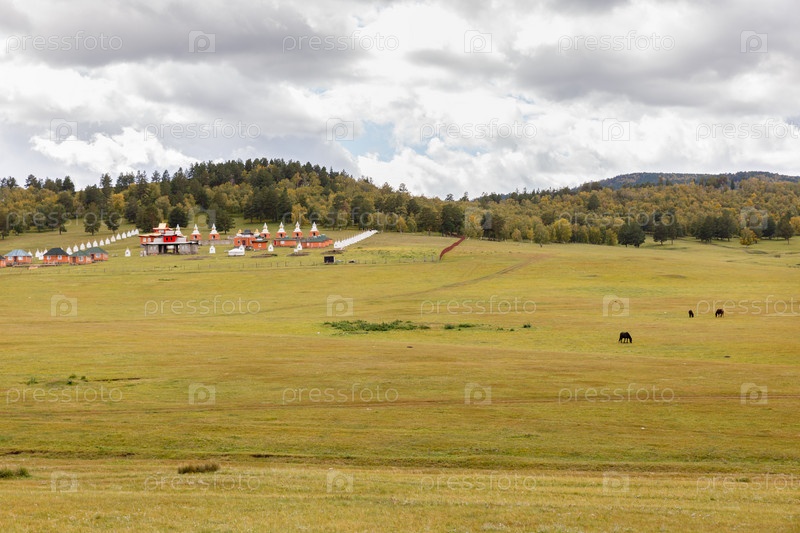 Буддийский монастырь в степях, ступы вдоль стены монгольского монастыря, Борнуур, Монголия
