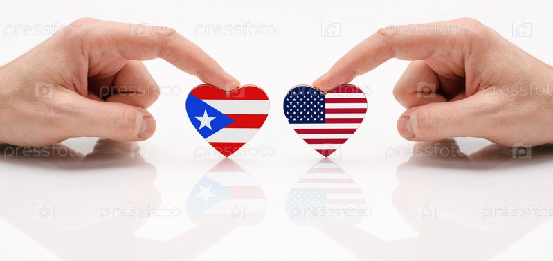 Концепция дружбы и дипломатических отношений между Пуэрто-Рико и США. Две мужские руки держат флаги в форме сердца на стеклянном столе. Флаг Пуэрто-Рико и США как символ сотрудничества и уважения