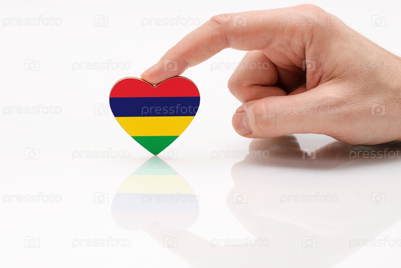 Флаг острова Маврикий. Любите и уважайте Маврикий. Мужская рука держит сердце в форме флага Маврикия на поверхности белого стекла. Концепция патриотизма и туризма