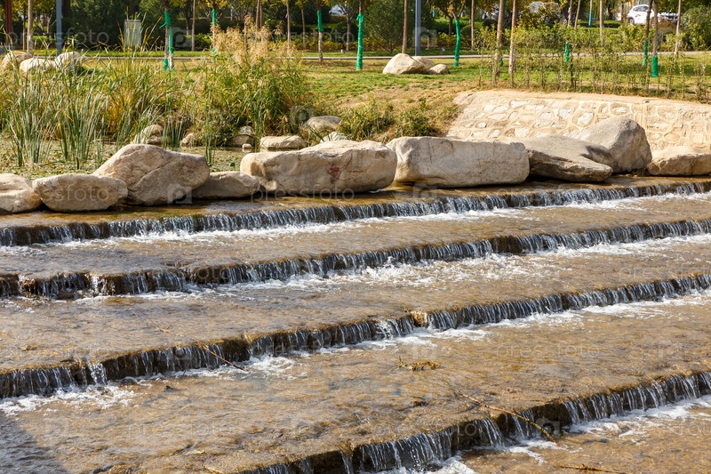 Декоративный водопад из натурального камня в виде ступеней. Парк в Сиане, Китай