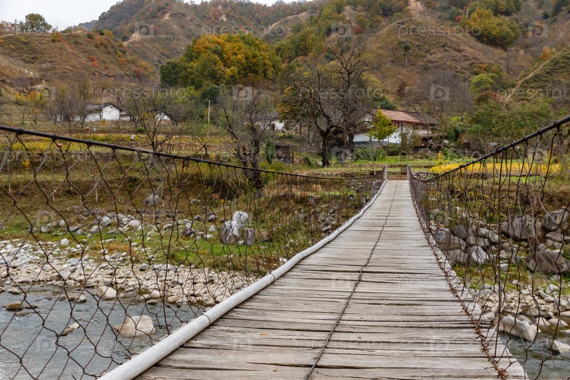 Деревянный подвесной мост через реку в горах, Китай, провинция Шэньси,