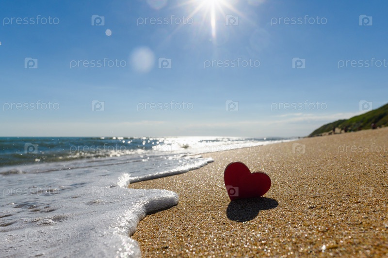 Маленькое сердце на берегу моря. Морская волна и деревянное сердце на песке. Селективный фокус на сердце