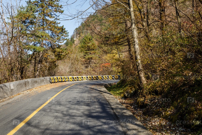 Асфальтированная дорога в горах, желтые и черные колеса автомобиля для защиты на национальной трассе g 210, Китай
