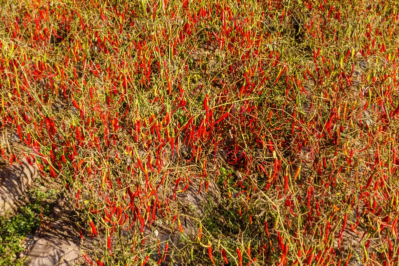 Свежий красный перец, растущий в огороде, фон