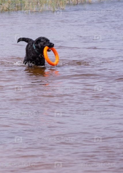 Лабрадорские собаки играют на озере в жаркий солнечный летний день