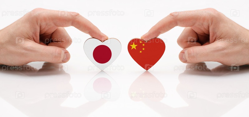 Концепция дружбы и дипломатических отношений между Японией и Китаем. Две руки держат флаги в форме сердца на стеклянном столе. Флаг Китайской Народной Республики и Японии