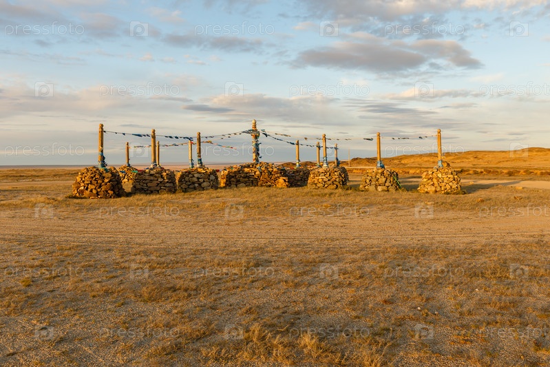 Монгольское Овоо, церемониальная груда камней на вершине горы, Монголия