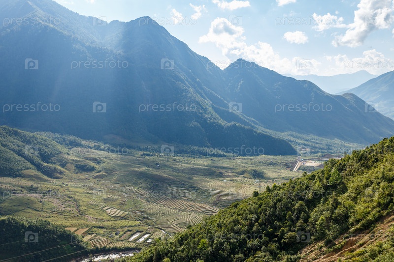 Рисовые террасы на склоне горы в лучах солнечного света. Солнечные лучи над холмами. красивый горный пейзаж, Вьетнам