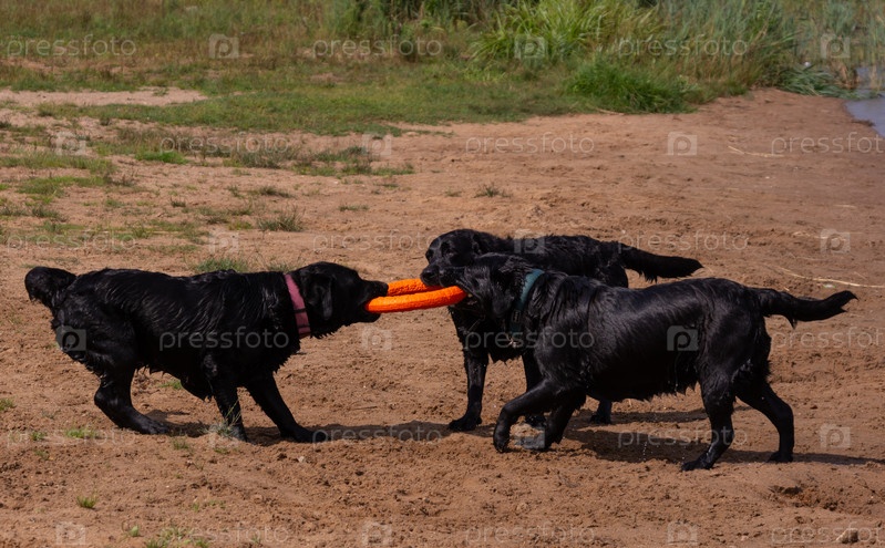 Лабрадорские собаки играют на озере в жаркий солнечный летний день