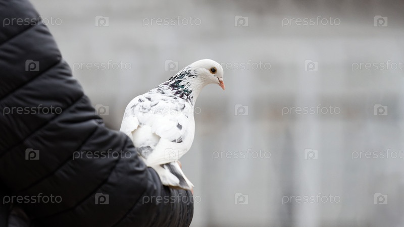 Голубь сидит на руке человека на размытом фоне. Копипространство