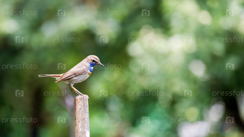Маленькая варакушка (Luscinia svecica cyanecula) на деревянном столбе забора на фоне зеленой размытой природы