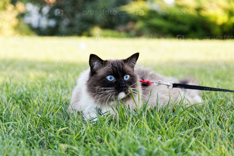 Портрет кошки с голубыми глазами породы тряпичная кукла, лежащей на траве на размытом фоне. Мелкий фокус