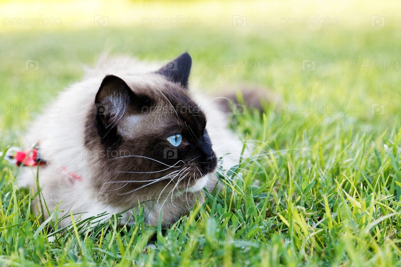 Голубоглазая кошка Рэгдолл лежит в траве и смотрит в сторону. Мелкий фокус