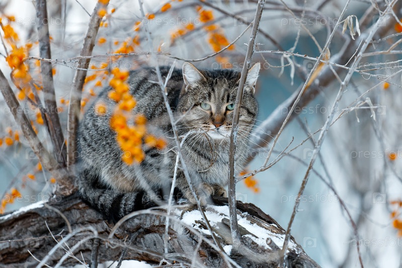 Кошка сидит на ветке рябины в морозный зимний день. Мелкий фокус