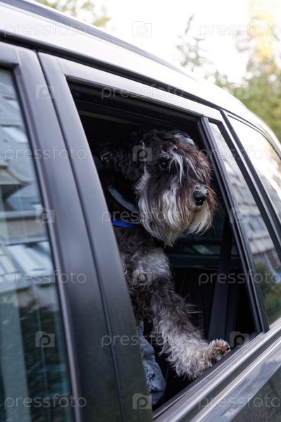 Крупным планом молодая собака Цвергшнауцер смотрит в открытое окно машины