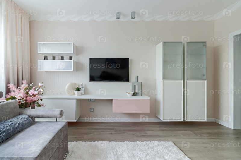 Современный стиль гостиной в бело-розовых тонах со шкафом и телевизором